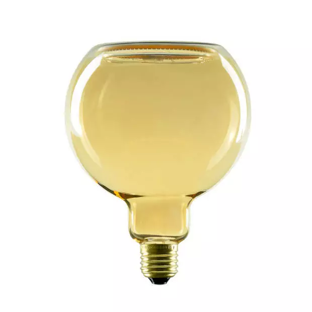 Deze G150 floating lamp E27 verbruikt 6 Watt en geeft 330 Lumen aan mooi warm wit licht (1900 Kelvin). De kleur van het glas is amber en de breedte is 15 cm, de totale hoogte is 18 cm.